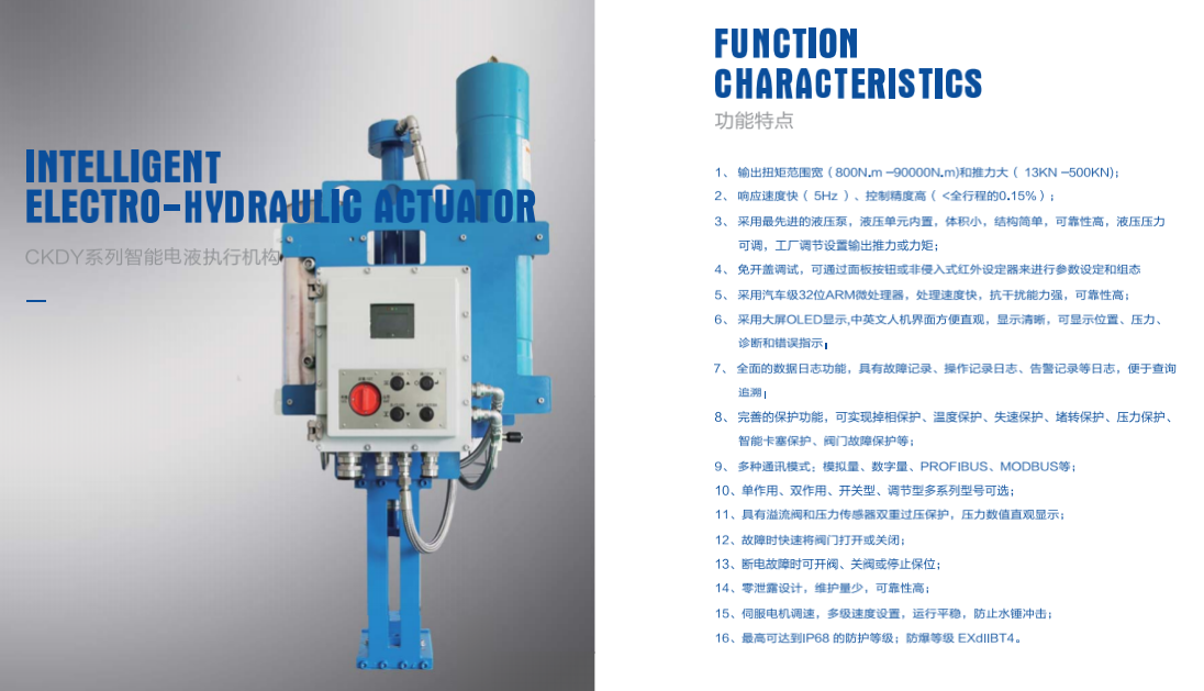 CKDY電液動平板閘閥奇眾牌液動執(zhí)行器結(jié)構(gòu)簡單、緊湊、體積小。傳動平穩(wěn)可靠,有緩沖無撞擊現(xiàn)象。可根據(jù)需要采用不同的液壓油,可在-45℃~+300℃溫度范圍內(nèi)工作,能防爆。可以獲得很大的輸出力矩,適合任何規(guī)格。輸出力矩可以通過定壓溢流閥得到精確的調(diào)整,包括開啟和關(guān)閉力矩的調(diào)整,甚至可以通過液壓儀表直接反映出來。在突然發(fā)生事故動力終斷時,仍可利用蓄能器進行一次或數(shù)次動力操作,這對長輸管線自動緊急切斷閥和進口噴放閥有特殊意義。