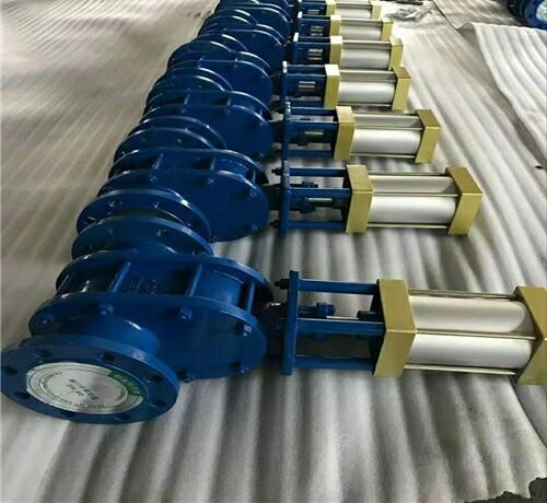 當氣源從上進氣口通入時,閥桿帶動閥板向下運動,閥門關(guān)閉。當氣源從下進氣口通入時,閥桿帶動閥板向上運動,閥門開啟。閥板與閥座之間加載彈簧,彈簧彈力始終使閥板壓向閥座保證閥門的密封性,又容許閥板在垂直上下方向移動,這有助于補償閥門零件的熱脹冷縮,并能克服任何背壓變化對密封的影響與防止顆粒介質(zhì)進入兩密封面之間。