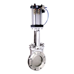 氣動刀型閘閥主要結構與特點 本閥主要由左、右閥體、U型密封圈、閘板、鋼螺母、閥桿、支架、氣缸等件組成,閥門啟閉靠氣缸動作來完成。